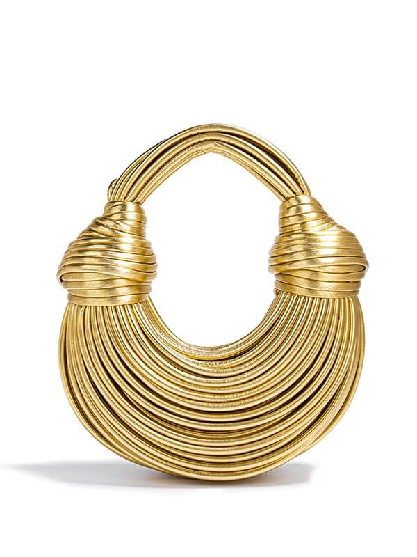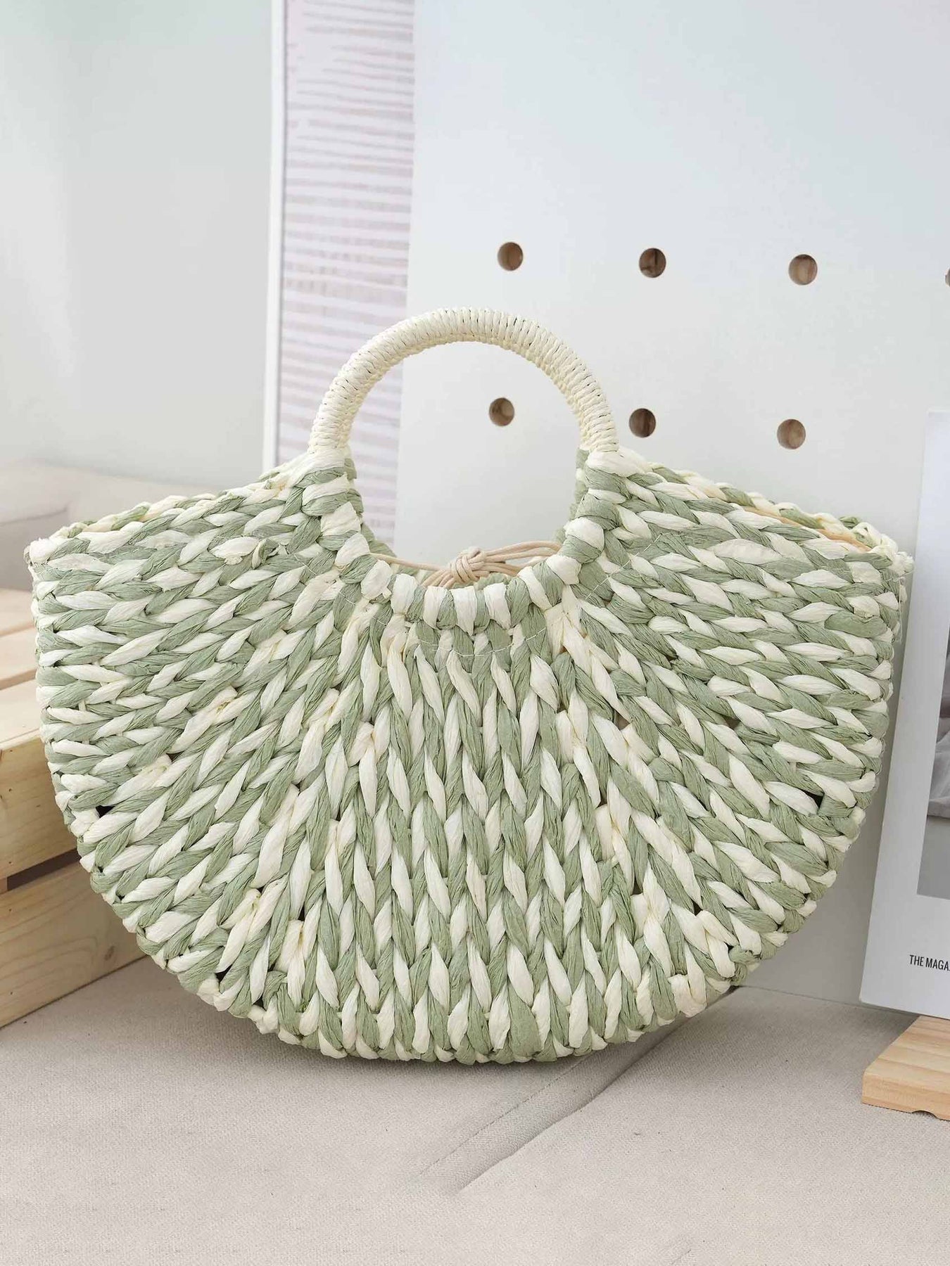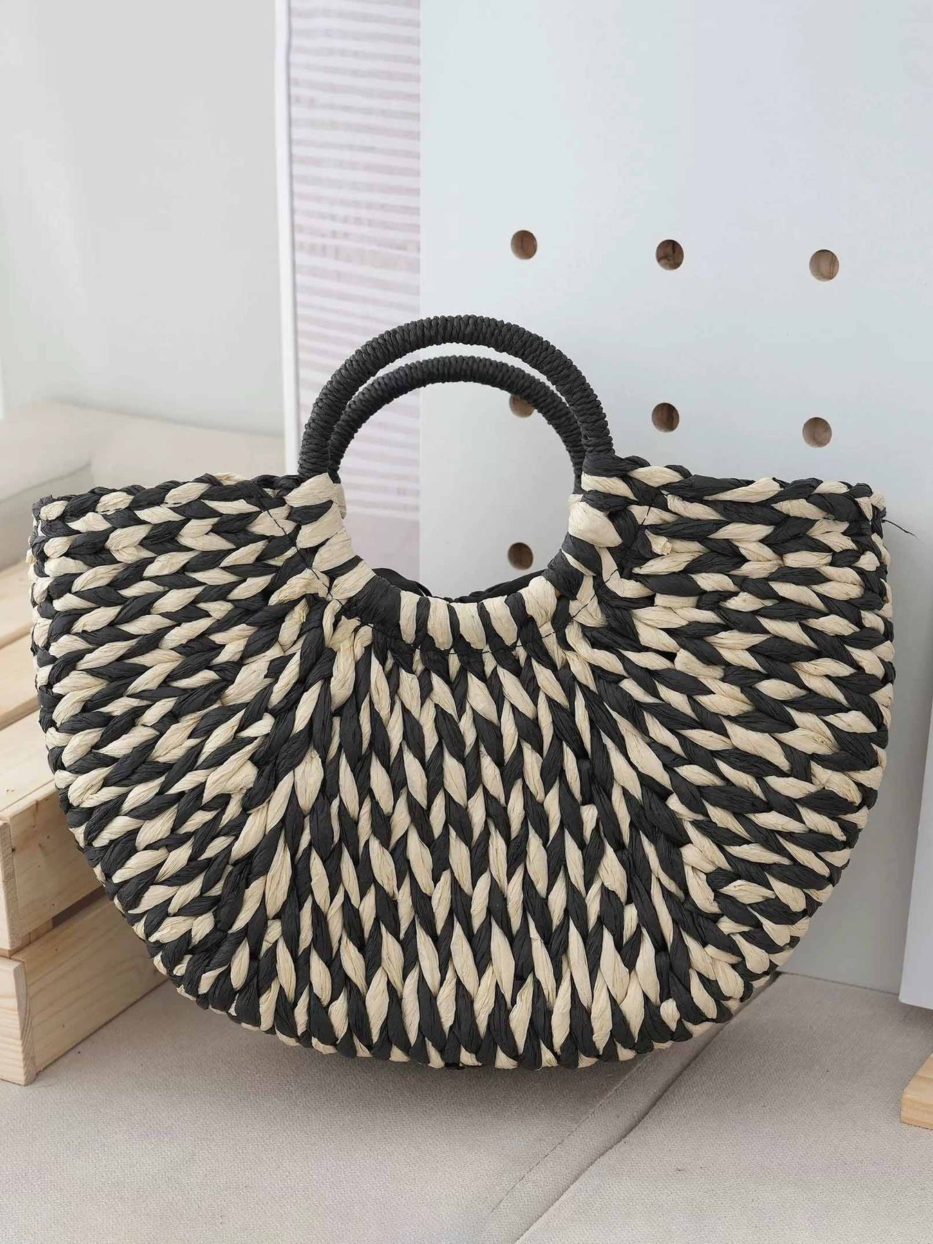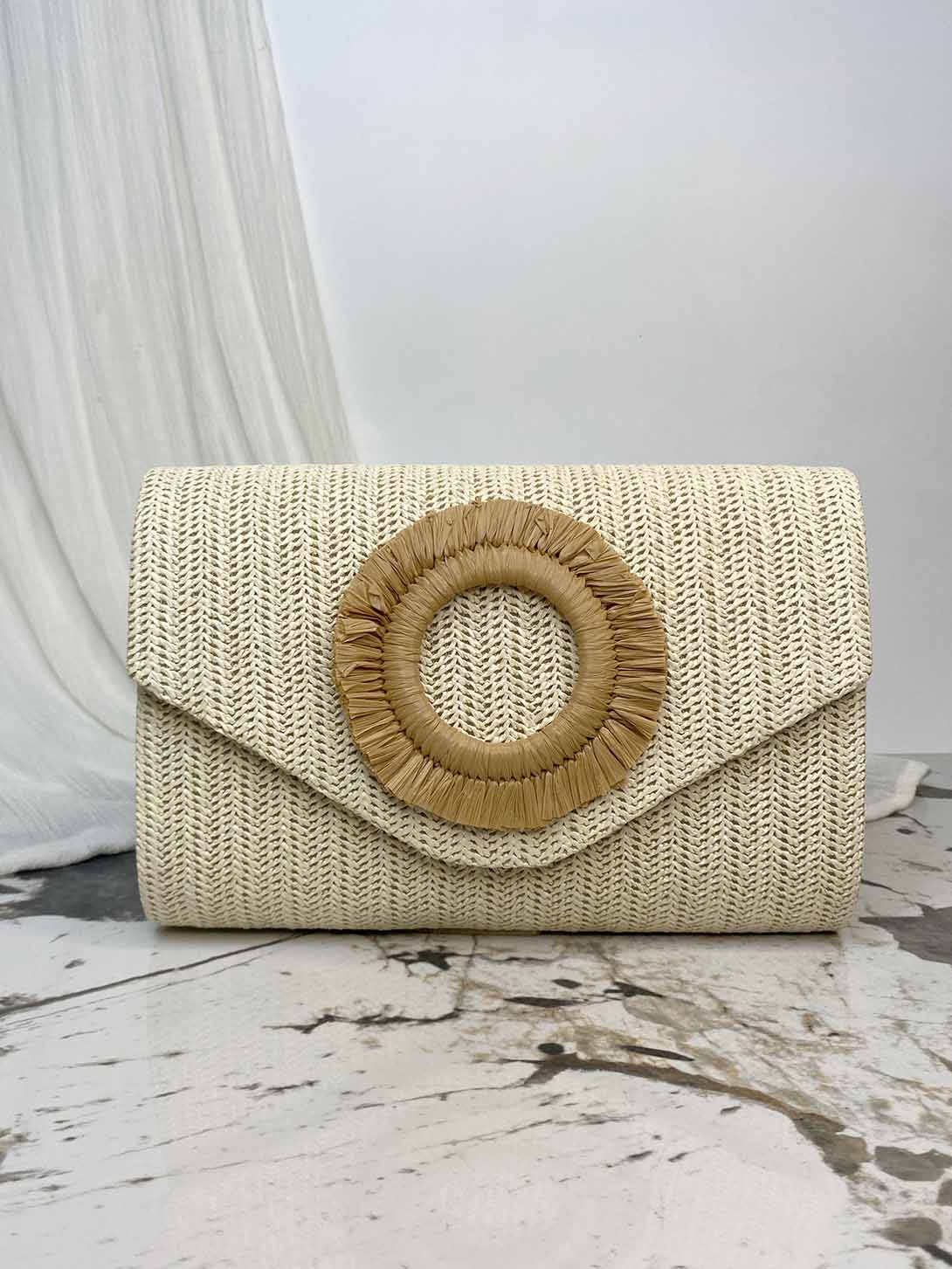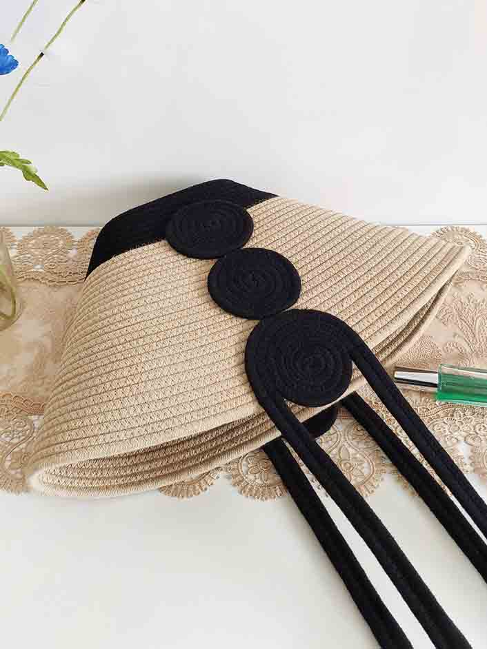 Elevate your style with our Vintage Coin Buckle Handbag, featuring woven cotton rope construction, a round rattan handle, and a chic diamond hollow pattern.