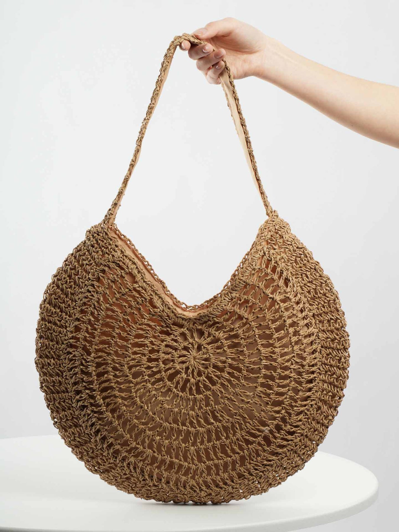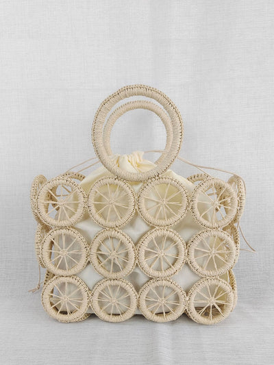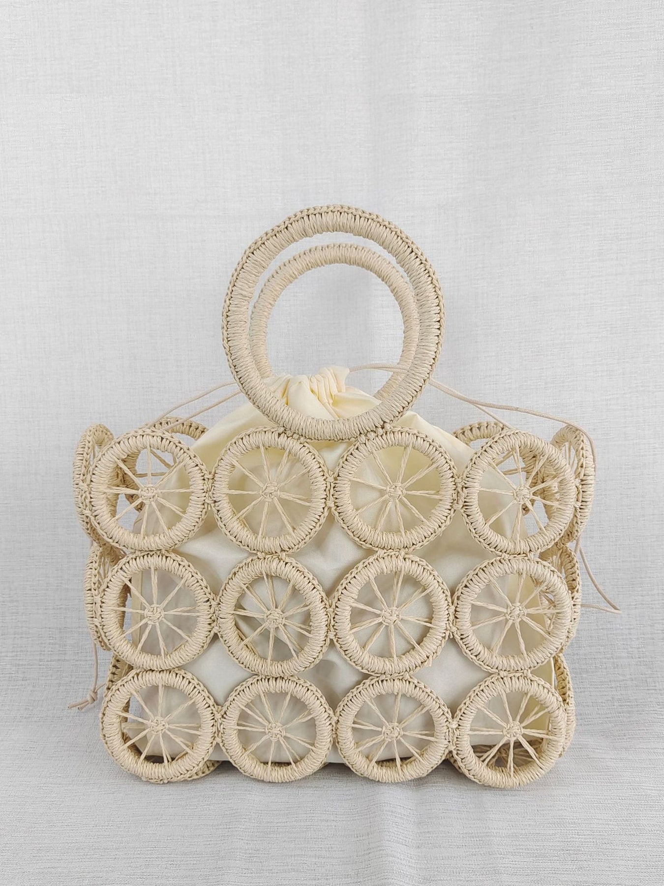 Vintage Coin Buckle Handbag: Woven Cotton Rope with Round Rattan Handle and Diamond Hollow Pattern