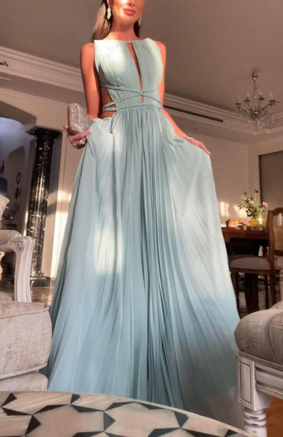 A perfect blend of elegance and sophistication, this elegant sleeveless pleated maxi dress with cutouts is timeless and stunning.
